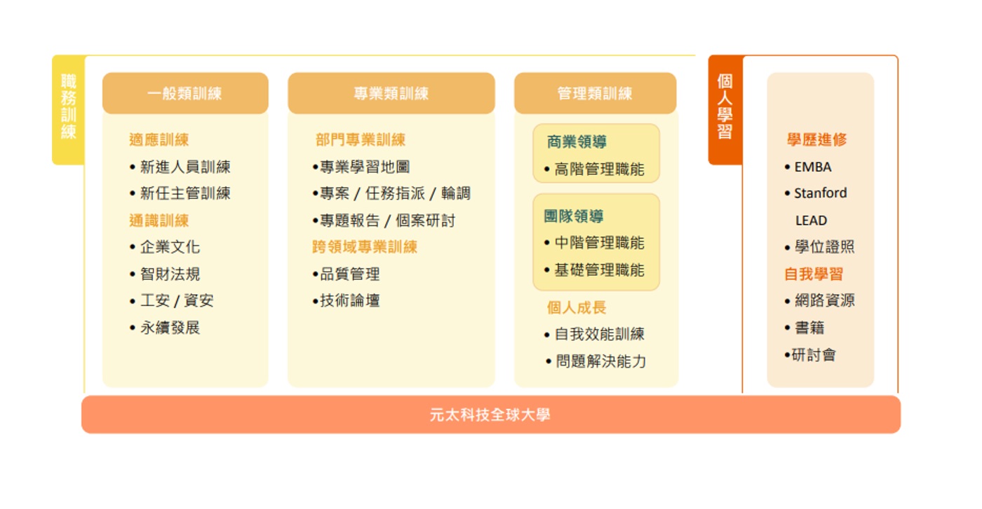 2025年,元太科技共開設507堂訓練課程,包括121梯次新人訓練、42梯次通識類課程、22梯次管理職能課程與322梯次專業職能教育訓練,累計15,497人次參與,訓練時數為14,560小時。而為鼓勵員工持續提升自我能力,將所學應用於工作崗位,元太科技持續提供員工在職進修補助,包括在職研究所與高階主管管理碩士學程等學術課程,2025年補助金額超過新台幣230萬元。