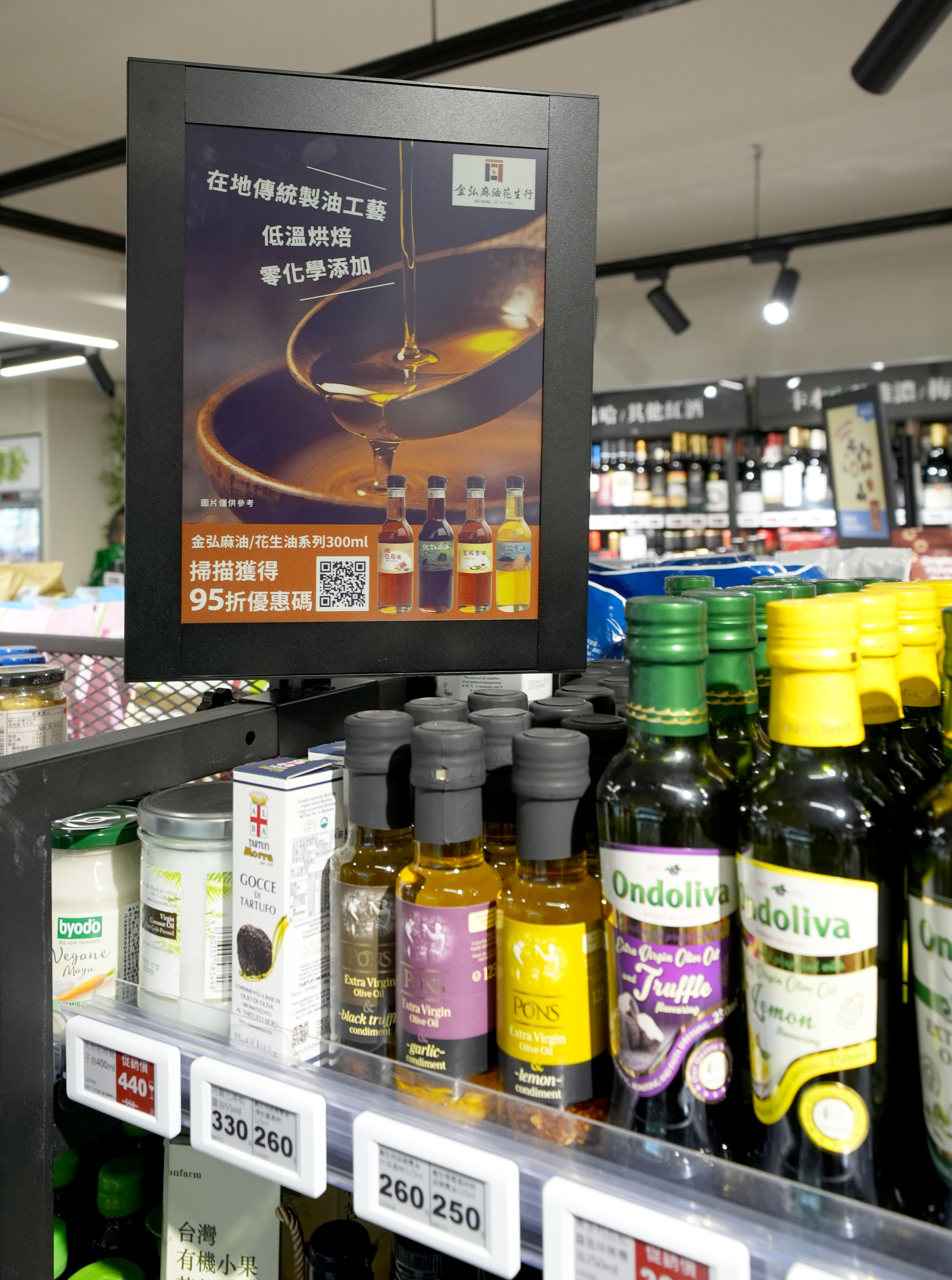 門店內的大尺寸廣告看板與貨架標籤皆可透過雲端系統同步管理,門市人員在促銷檔期更替時,無須列印或人工更換紙本海報,不僅降低人力與物料成本,也為實體門店創造更多可靈活運用的廣告版位。