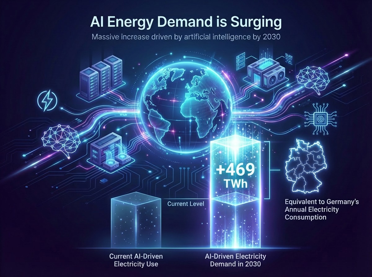 AI 的蓬勃發展,猶如一場數位重工業革命,其對能源的渴求超乎想像。根據預估,到 2030 年,AI 每年將消耗約 9450 億度電,較當前水平增加了 4690億度電,這項驚人的增長,足足相當於德國一整年的能源需求,並將額外帶來約 703.5 億美元的電力成本。這樣的數字不僅揭示了 AI 的發展規模,也讓「能源」從幕後議題,轉變為影響 AI 未來發展的關鍵變數。