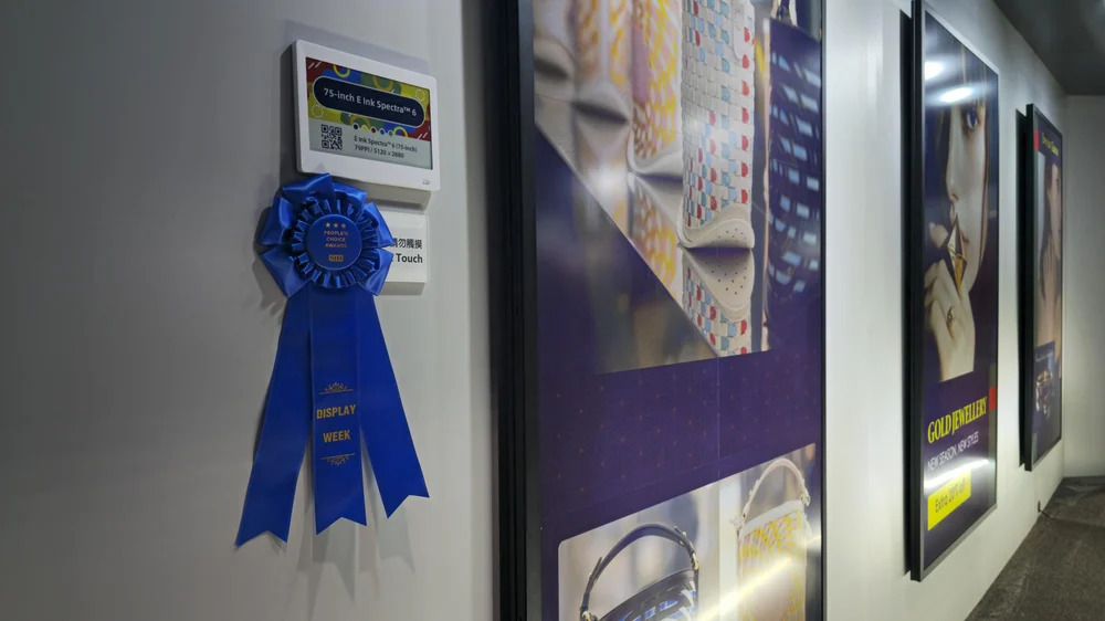 今年展區最吸睛的亮點之一,莫過於 E Ink Spectra 6 的精彩展示。展位正面一次陳列六台 75 吋大型彩色電子紙螢幕,遠遠就能感受到其震撼力。Spectra 6 帶來更飽和的色彩、更深邃的黑色以及更高的對比度,吸引了絡繹不絕的參觀人潮。Spectra 6 的人氣不只來自技術突破,更獲得 Display Week人氣票選最佳顯示元件獎(People’s Choice Award – Best Display Component),無疑成為全場最受歡迎的明星技術之一。