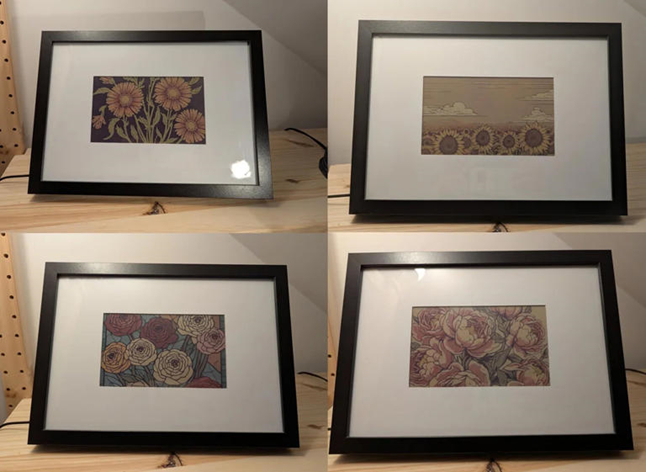 最後一個專案結合了 7 吋 E Ink 顯示器與 AI 程式,創作出一幅幅獨一無二的花卉畫作。所有硬體設備都巧妙地收納在畫框內部,整體外觀乾淨俐落,完全沒有線材外露的問題。