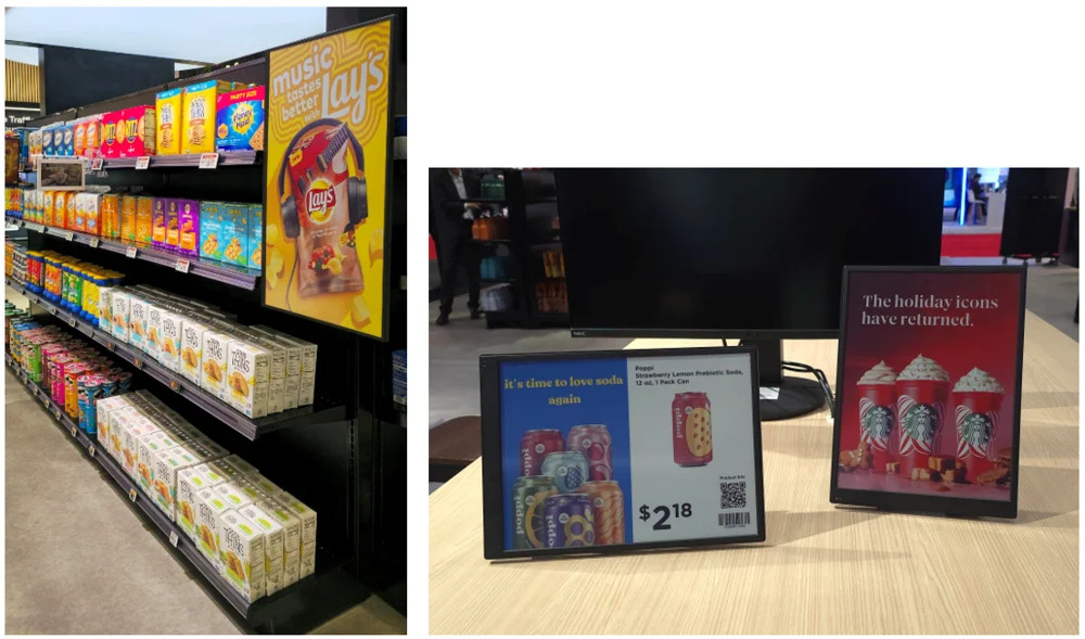 展位中也展示了多款全彩電子紙看板,播放如 Starbucks、Lay’s 等品牌的廣告內容。其中一面牆更整合了多種尺寸的 Spectra 6 顯示器,包含單一大型看板與拼接式顯示牆,充分展現電子紙在端架(endcap)、ESL 與大型廣告看板等不同應用場景下的彈性與多樣性。