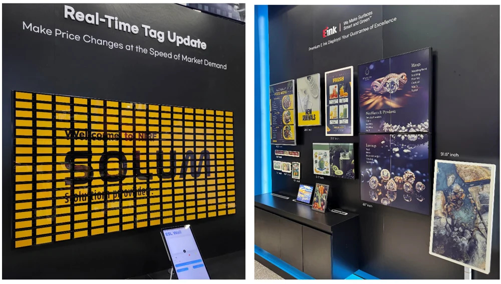 今年的 NRF 展會現場,E Ink 可說是無所不在!從電子貨架標籤(ESL)到大型全彩電子紙看板,幾乎走到哪裡都能看到 E Ink 的身影。在本篇回顧中,我們將帶大家看看幾家參展夥伴的展位設計,以及他們如何在現場呈現電子紙應用。